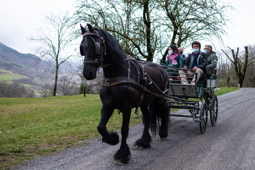 Gli esemplari avelignesi (o Haflinger) si distinguono per il mantello sauro, la coda e la criniera chiare. Devono il proprio nome al paese di Avelengo, Bolzano (chiamato Hafling in tedesco). A trainare la carrozza, invece, è un frisone femmina con il manto nero, una delle razze equine più antiche in Europa, che ebbe origine in Frisia, tra i Paesi Bassi e la Germania. «Al posto delle tradizionali selle americane o inglesi, per la monta utilizziamo la cosiddetta “Bareback Pad”, precisa Mara. «Si tratta di una sorta di “cuscino da equitazione” che ci permette, all’occorrenza, di montare in due, per esempio quando un bambino vuole salire sul cavallo ma preferisce farlo insieme a un adulto. Mentre aspettano il proprio turno, i camper possono fare amicizia con gli altri animali della fattoria: due capre, un asino e un pony Shetland. Possono spazzolarli, pettinarli e portarli al pascolo». Tante volte al Camp, i cavalli hanno prestato un paio di ali ai bambini. «Una volta uno ci confessò che conviveva con tante paure e, tra queste, c’era anche quella nei confronti di questo animale», ricorda Mara. «Era determinato però a sconfiggere almeno una paura della sua vita e decise di cogliere l’opportunità. Quando concluse l’attività, con le lacrime agli occhi ringraziò la cavalla abbracciandola e baciandola. Per noi è stato meraviglioso. Un altro bambino ci chiese una lista delle cose necessarie ad accudire un cavallo, perché da grande sognava di fare il veterinario e, nel frattempo, voleva esercitarsi. Tornato a casa ha cominciato a frequentare un maneggio. Un adolescente, invece, giorni dopo l’esperienza in carrozza, chiese di andare a salutare la cavalla. L’animale, che si solito si atteggia un po’ a diva, fece un gesto del tutto inaspettato: dal suo box allungò il collo così tanto da riuscire ad appoggiare il suo muso sulla sedia a rotelle del ragazzo: un momento emozionantissimo anche per noi».