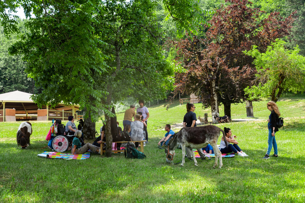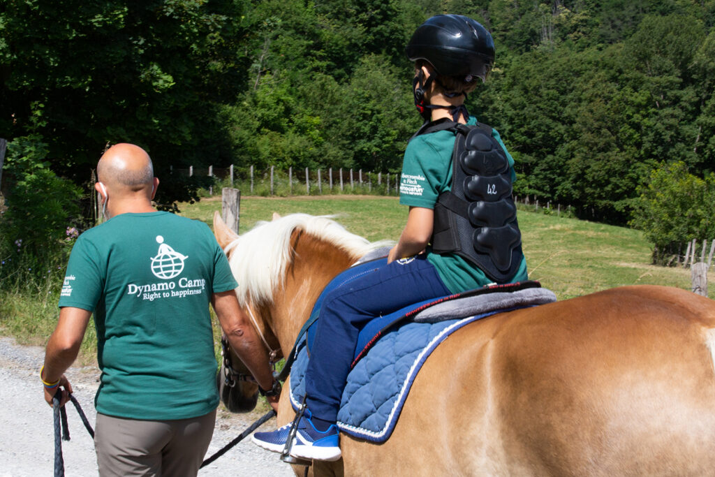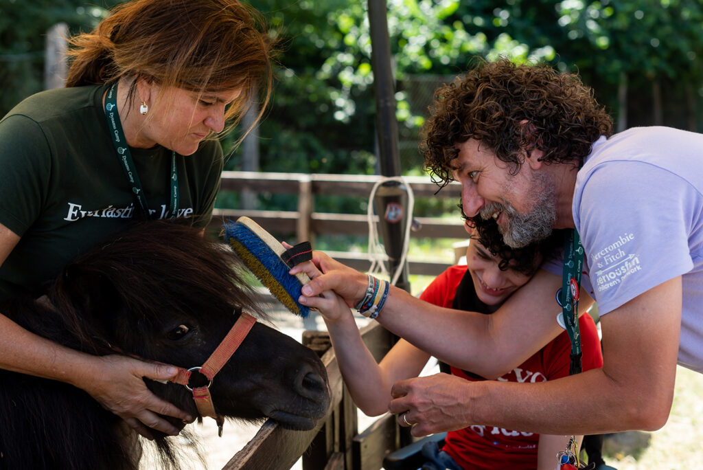 «I cavalli ci prestano le ali che ci mancano. Abbiamo dimenticato come sia strano che un animale così grande, possente e intelligente permetta a un altro ben più debole animale di montargli in groppa». Peter Gray, ricercatore e psicologo americano, ci ricorda quanto speciale sia l’empatia che si instaura tra il cavallo e l’uomo. Lo sanno bene i camper, quando scoprono la straordinaria sensibilità di questo animale grazie a una delle attività di Terapia Ricreativa: l’equitazione. «Abbiamo quattro cavalli avelignesi addestrati per le attività con i bambini all’insegna dell’accessibilità», spiega Mara Luconi, responsabile di quest’area. «Alcuni sono già innamorati dei cavalli e non vedono l’ora di montarne uno, altri invece sono impauriti da tanta possenza. Come sempre, diamo la possibilità di scegliere: chi non se la sente di montare, o chi ha già cavalcato in passato e vuole provare una nuova esperienza, può optare per la passeggiata in carrozza. Nessuno, però, può provare entrambe le attività, perché ci sono camper che per varie problematiche non possono scegliere. Il primo approccio avviene in una struttura circolare che ha una rampa accessibile a chiunque e che consente di accarezzare gli animali stando alla loro altezza».